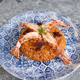 An opulent risotto infused with prawn bisque, white wine, and lemon zest crowned with succulent roasted Argentine prawns and smoky chorizo, finished with butter, and parmesan.